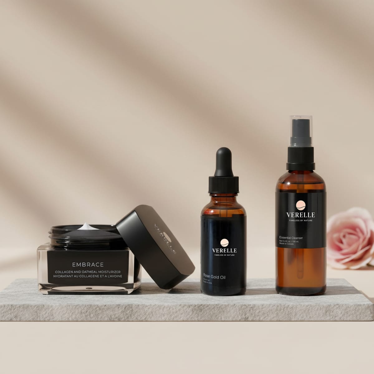 At Verelle, our mission is to empower every individual to embrace their natural beauty through pure, effective, and luxurious skincare. We believe that healthy, radiant skin starts with nature’s finest ingredients and gentle care. Our products — the Anti-Aging Rose Gold Oil, Essential Cleanser with herbal and chamomile blend, and Embrace Collagen Moisturizer — are crafted to nourish, rejuvenate, and restore balance to your skin. We are committed to creating skincare that’s not only powerful but also safe and cruelty-free. Verelle stands for confidence, self-care, and timeless beauty — helping you glow at every stage of life.